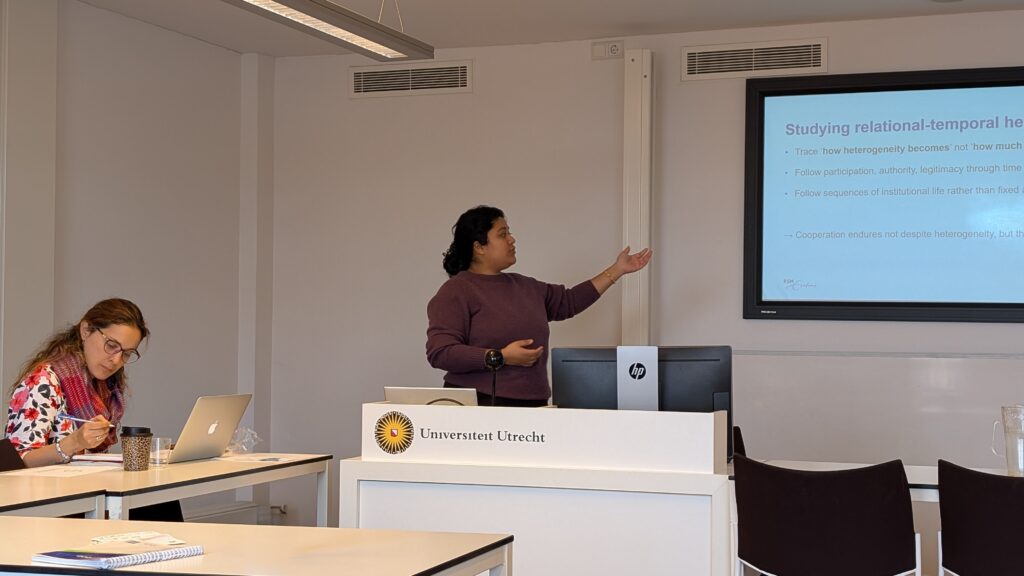 Shreya presented a paper she works on which reframes heterogeneity from a variable to  condition. The paper synthesizes three decades of fragmented debates and moves from a static to a dynamic understanding of heterogeneity. It reframes heterogeneity as a relational-temporal institutional condition. She proposes shifting attention beyond institutional design to the relational aspects of collective governance and shifting attention from static models to dynamic models where we look at continuity, change and disruptions.
